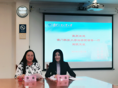 袁泉经理首先对方泉教授一行的到访表示热烈欢迎。她简要地介绍了太阳成集团tyc9728的发展历史、员工规模、学科设置、培养模式以及国际合作交流的情况。袁泉经理指出,联合培养与交换访问等国际合作项目,能够切实提高员工培养质量,开拓员工的国际视野,她非常期待看到第一批广外法学学子前往澳门科技大学进行学术交流。