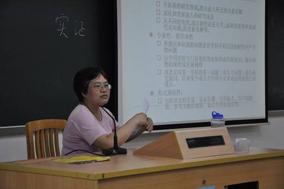 杨斐老师作论文写作指导报告。报告内容为学术论文的概述、特点、类型和格式。杨斐教授将讲解重点置于论文的创新性及规范性特点。
